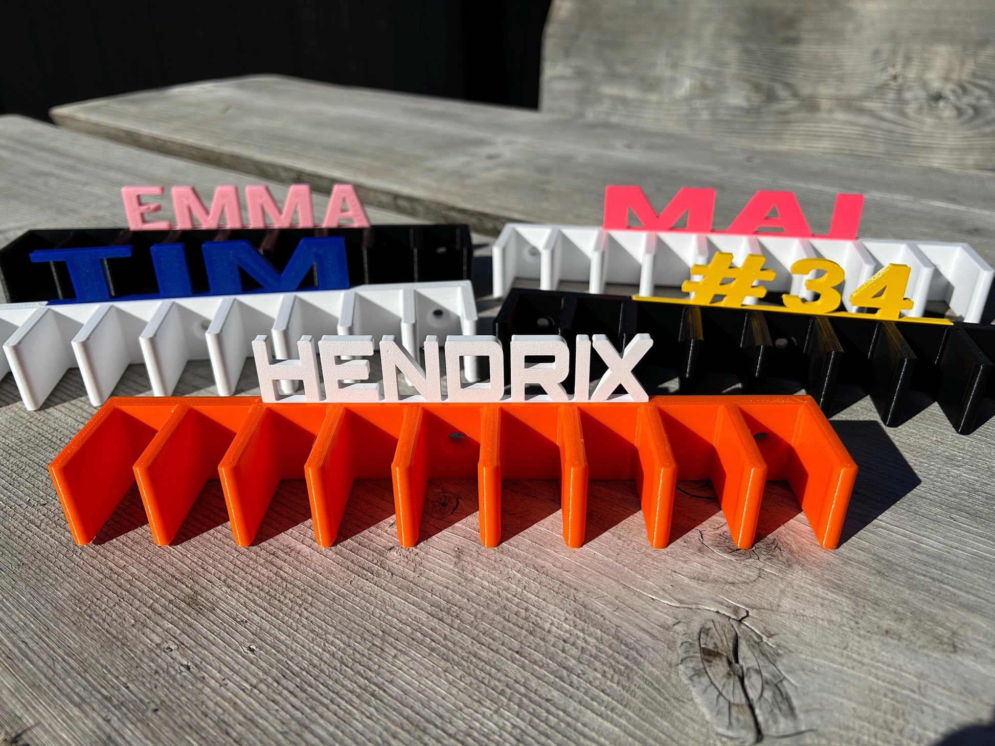 Keep up to 9 hockey sticks neatly stored and off the floor with our wall-mount hockey stick rack. Personalize it with a name (up to 13 characters) or the phrase "I Love Hockey" for a unique and practical addition to any space.