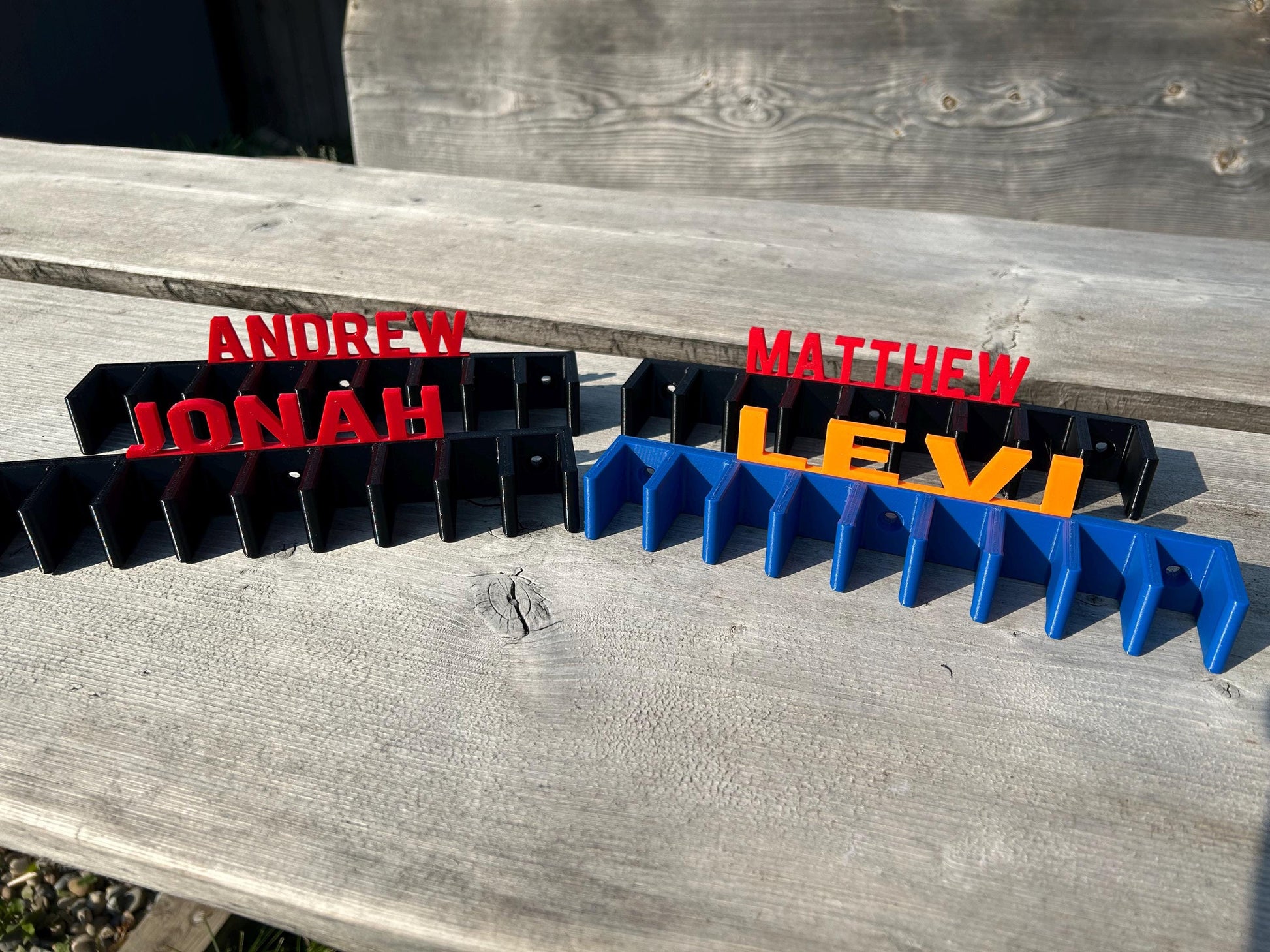 Keep up to 9 hockey sticks neatly stored and off the floor with our wall-mount hockey stick rack. Personalize it with a name (up to 13 characters) or the phrase "I Love Hockey" for a unique and practical addition to any space.